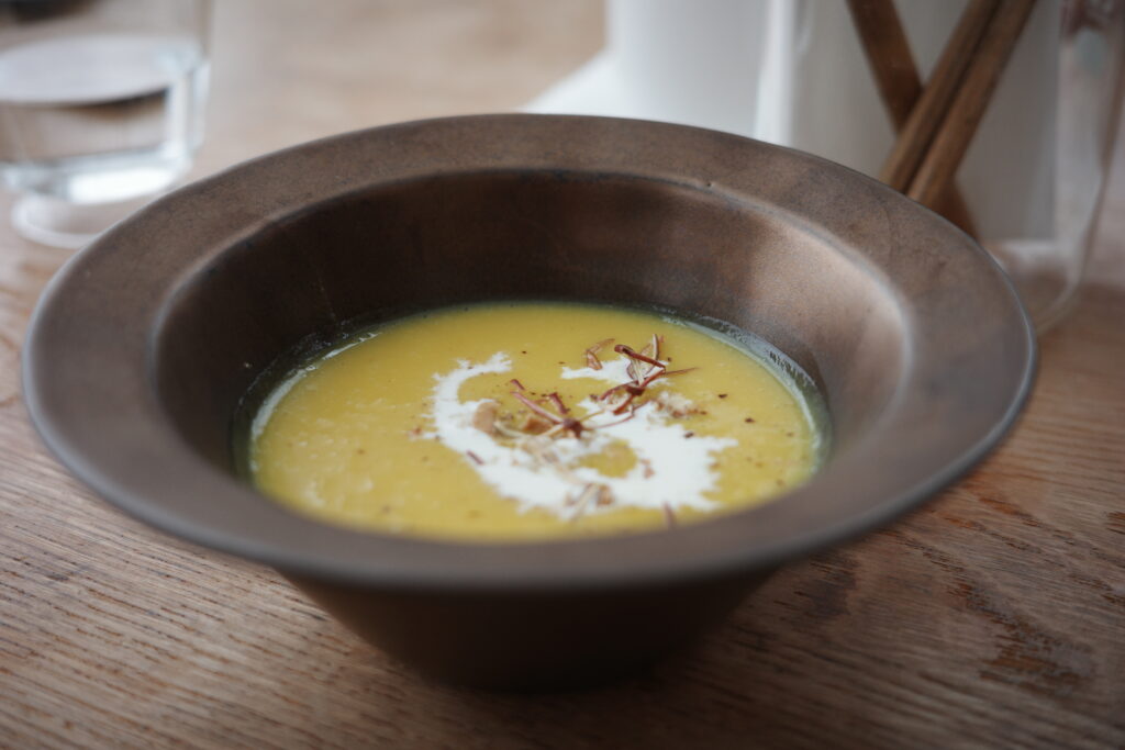 スープはかぼちゃとリンゴのポタージュ、さわやかな香りと甘さでおいしい。