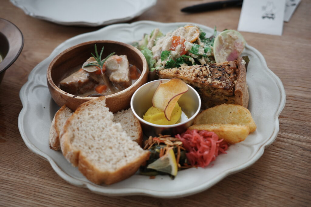 プレートはサラダ、キッシュ、豚肉のシチュー、パン、など多種盛り合わせてあり全部丁寧に作られていてそれぞれどれも美味しい。