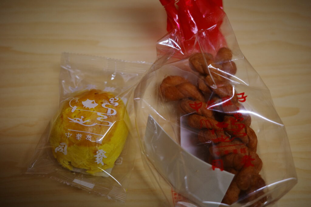 中華街で買ったお菓子、ネジネジの方あっさりした甘さサクサク。塩玉子入りカスタードパイ甘いカスタードに塩気の有るアヒルの黄身ずっしり。