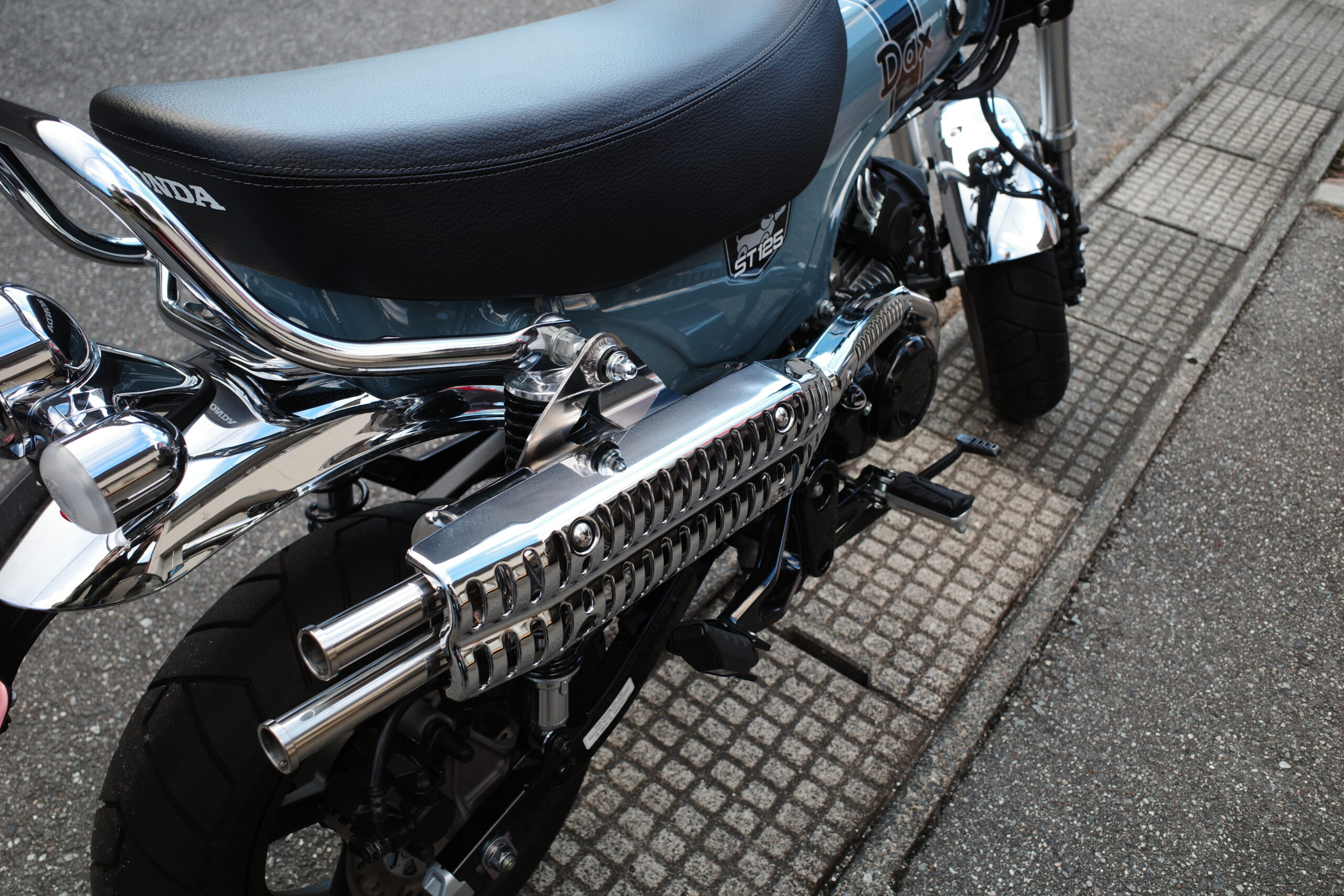 Dax125マフラー交換 バイクのカスタムの定番、マフラー交換。 やっぱちょっとワイルドな排気音や、イメチェン…