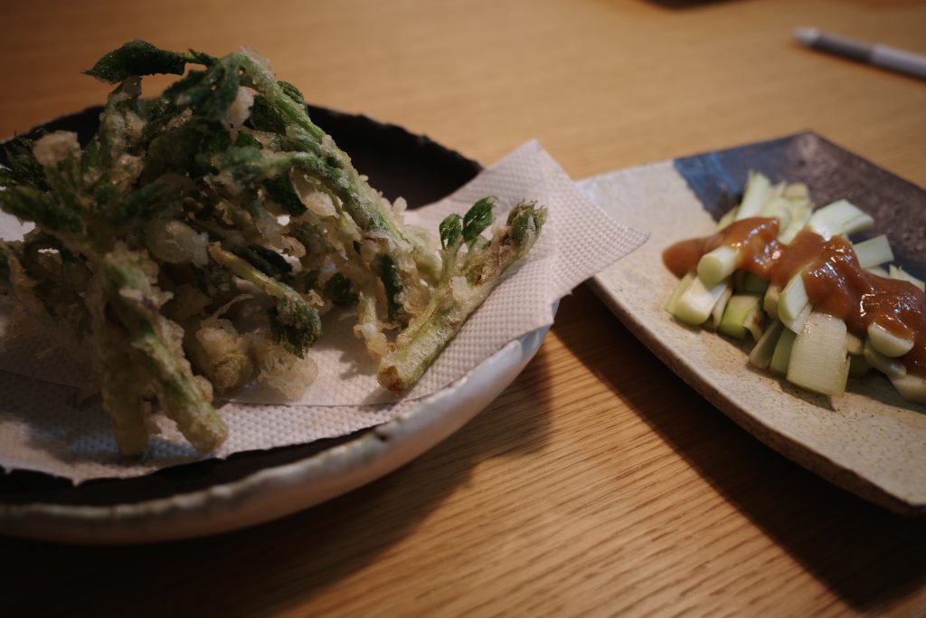 タラの芽のてんぷらとウドの酢味噌和え