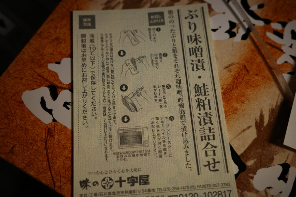 鮭は粕漬、ぶりは味噌漬けそれぞれ3切れずつ入っています。